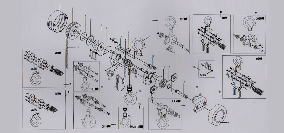 手拉葫蘆由外部罩殼保護(hù)系統(tǒng)與運(yùn)行支承裝置與運(yùn)行驅(qū)動(dòng)裝置三大部分組成。手拉葫蘆的大大小小組件共有七十余個(gè),每一個(gè)部件都有自己的作用,主要部件包括如下: